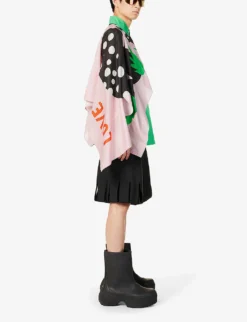 - Oversized fit, long sleeves, pleated cuffs, two buttoned flap pockets at chest, western yoke, graphic print at back, pearlescent buttons, curved hem