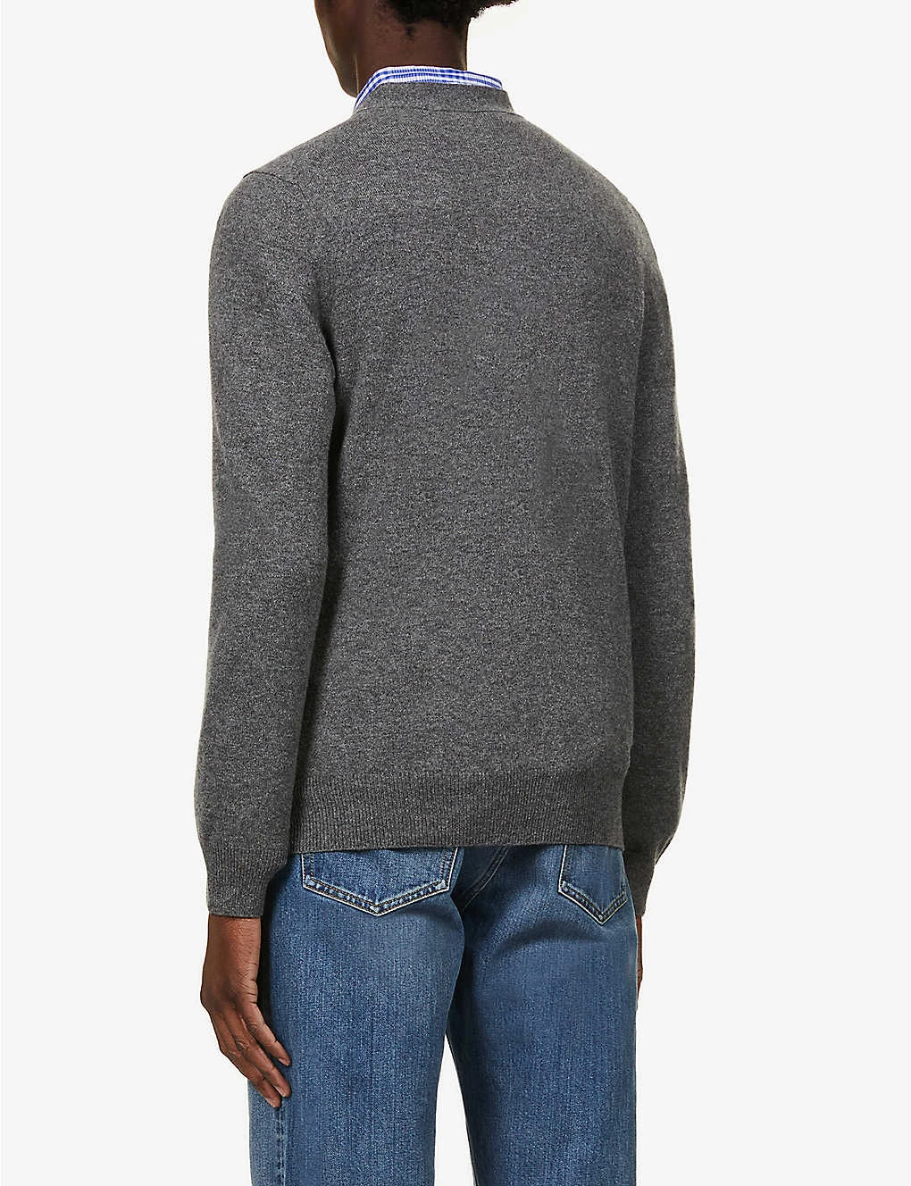 - V-neck, long sleeves, branded tab at chest, fine knit, relaxed fit, ribbed trims