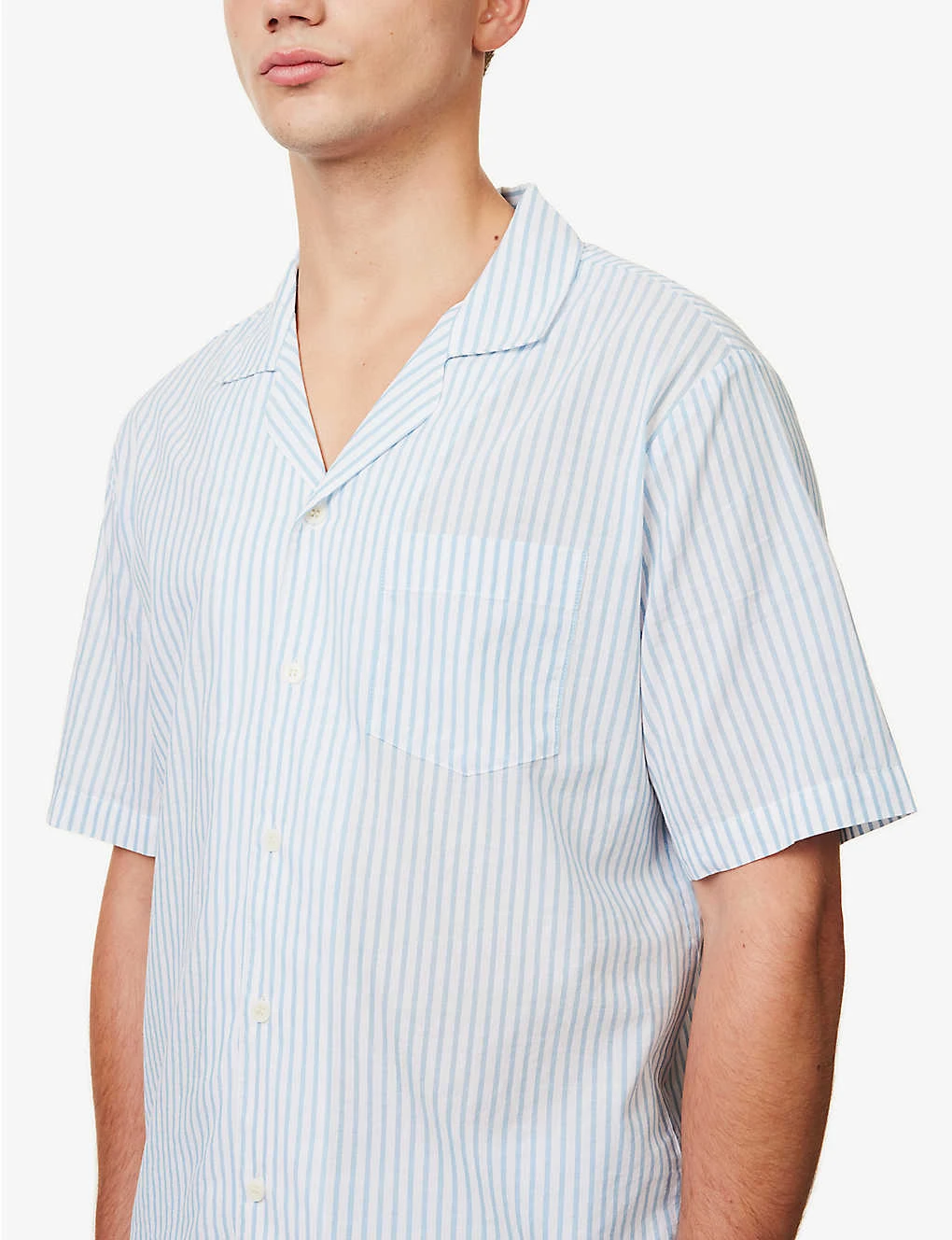 - Regular fit, camp collar, short sleeves, patch pocket at chest, all-over striped pattern