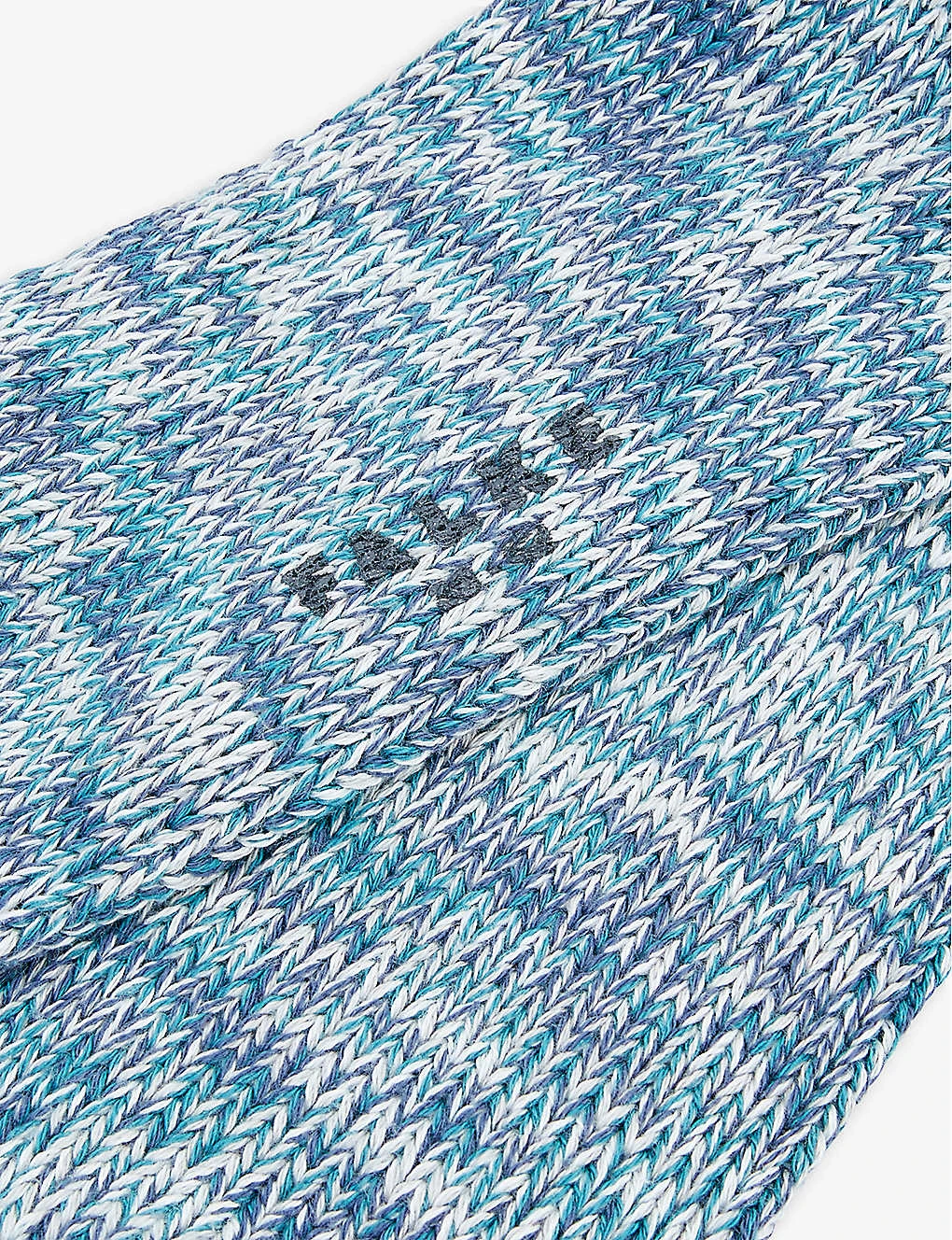 - Ankle rise, brand print sole, all over cable-knit pattern, all over ribbed
