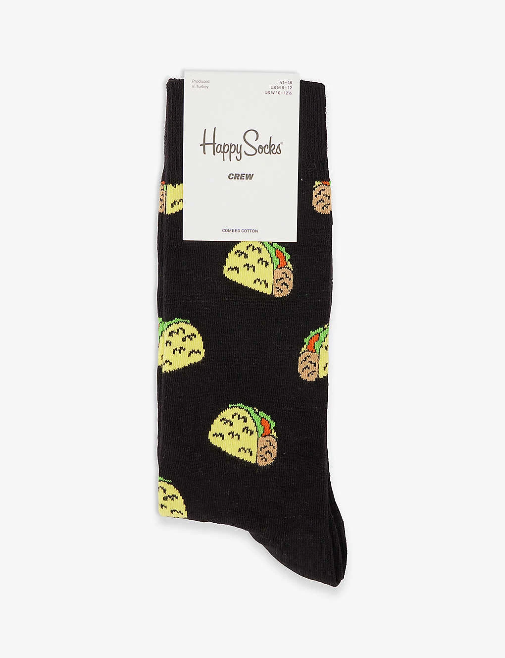 - Ankle rise, ribbed elasticated cuffs, brand print at sole, all over taco print, contrast toe panel