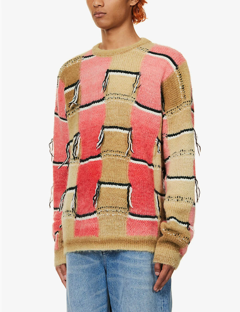 - Relaxed fit, crewneck, dropped shoulders, long sleeves, medium knit, all-over patchwork pattern and contrast threads, ribbed trims
