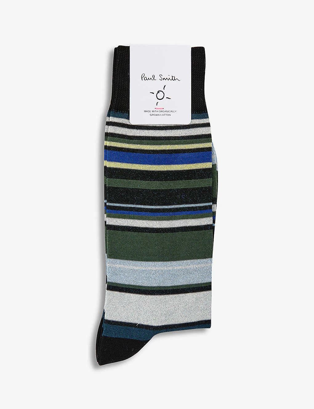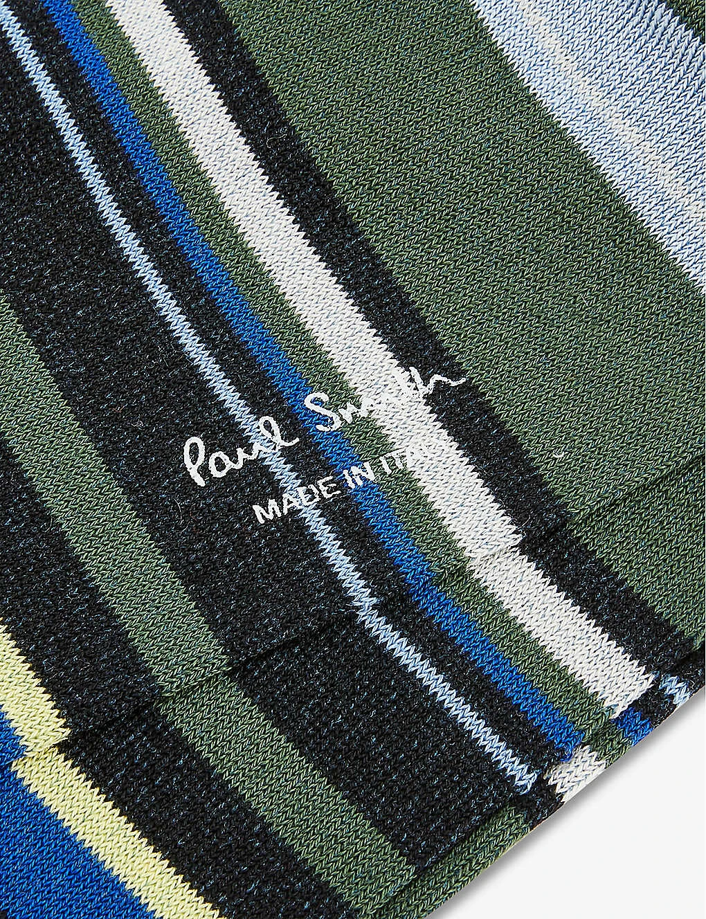 - Ankle rise, ribbed elasticated cuffs, brand print sole, all over striped, contrast panel at heel and toe