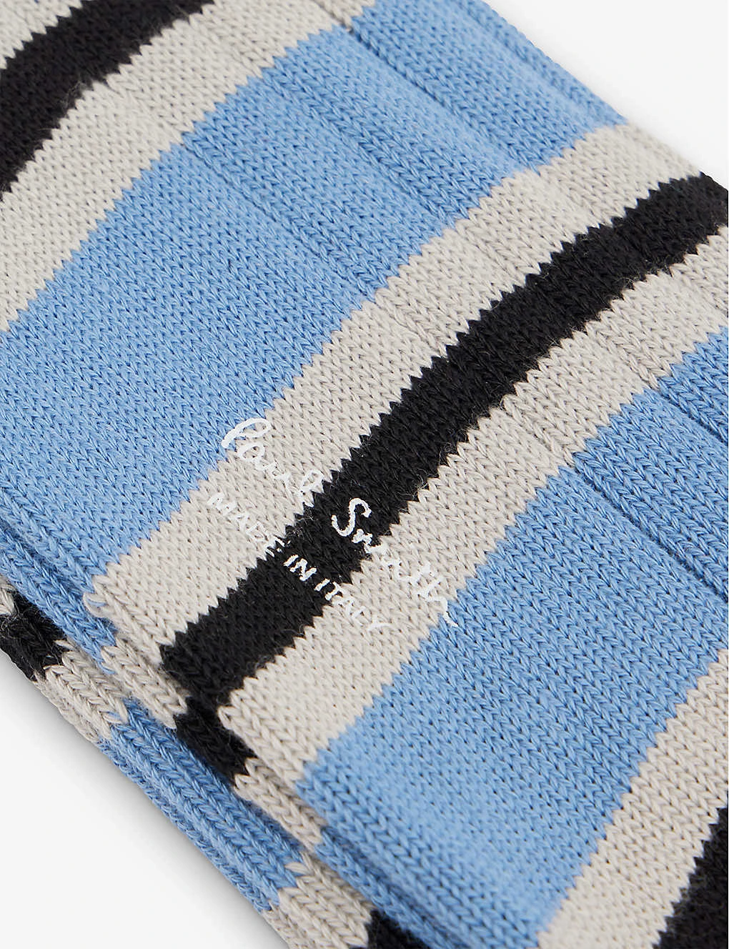 - Ankle rise, elasticated cuffs, brand print sole, all over striped print, all over ribbed and knitted