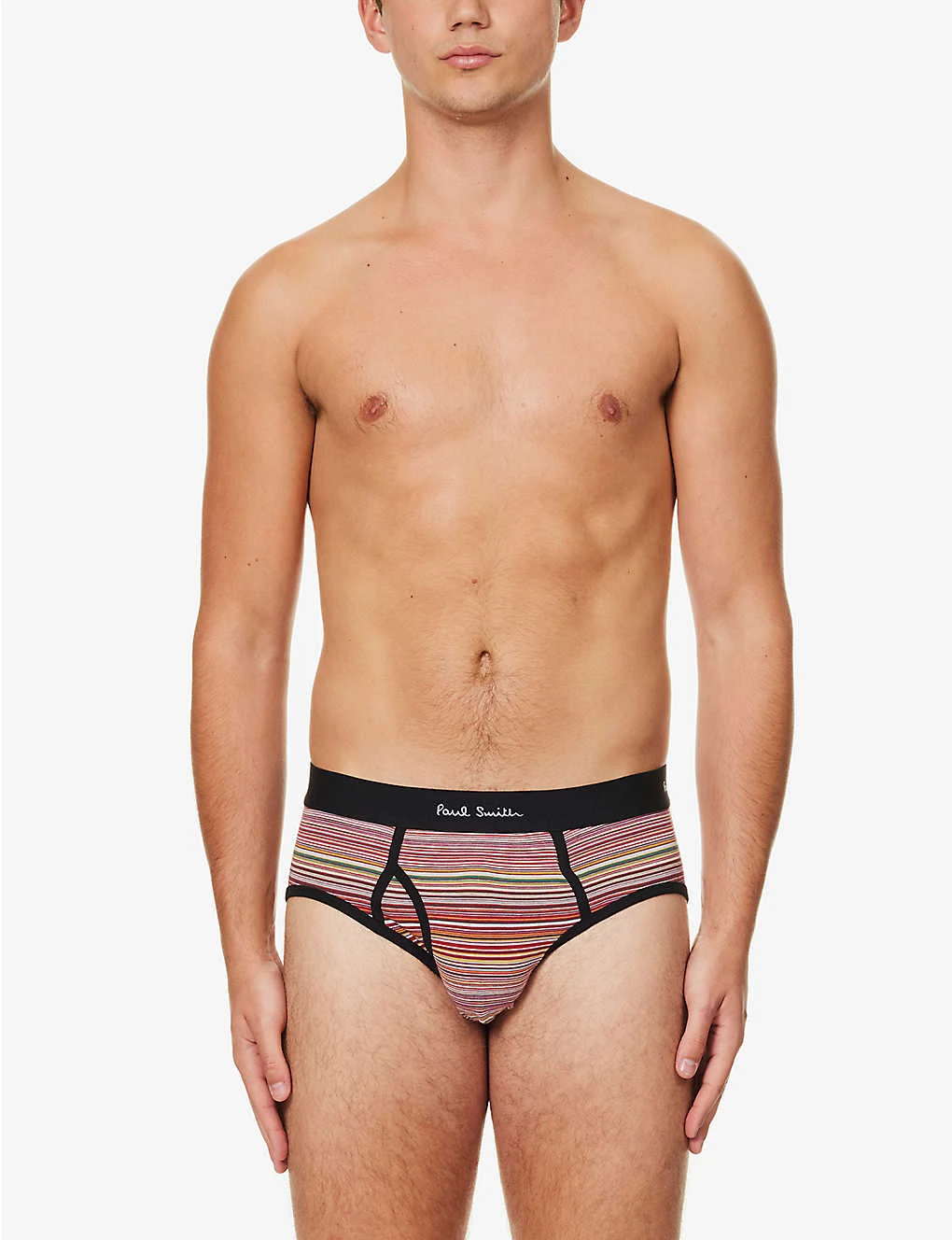 - Slim fit, mid- rise, branded elasticated waistband, protective pouch at front, all over striped print, elasticated trims