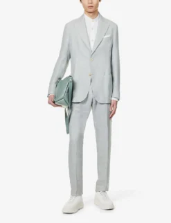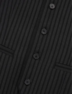 - Regular fit, notched lapels, padded shoulders, long sleeves, buttoned cuffs, darts at front, two flap pockets at front, three slip pockets at interior, fully lined
