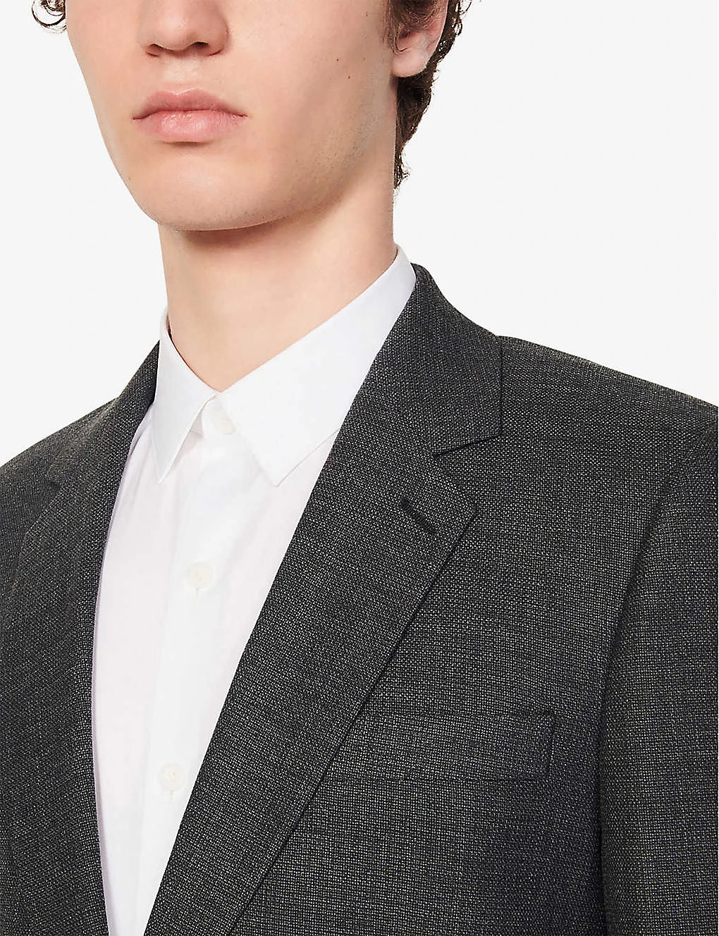 - Notch lapels, long sleeves, single-breasted, padded shoulders, four functioning buttons at cuffs, one buttonhole at lapel, one welt pocket at chest, two patch pockets at front, all-over woven pattern, single vent at back hem, four interior pockets, fully lined
