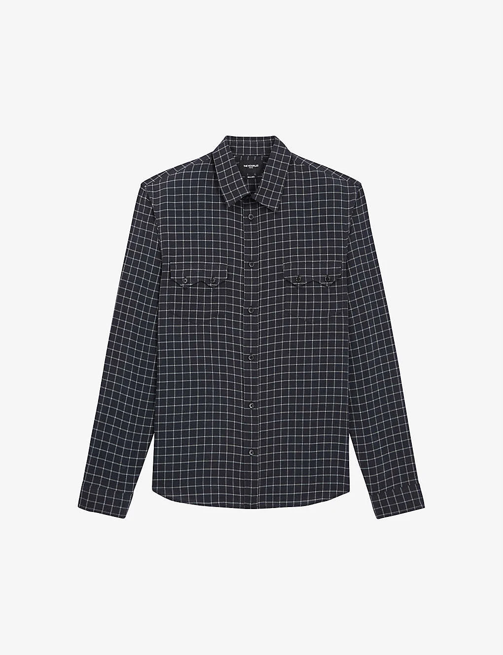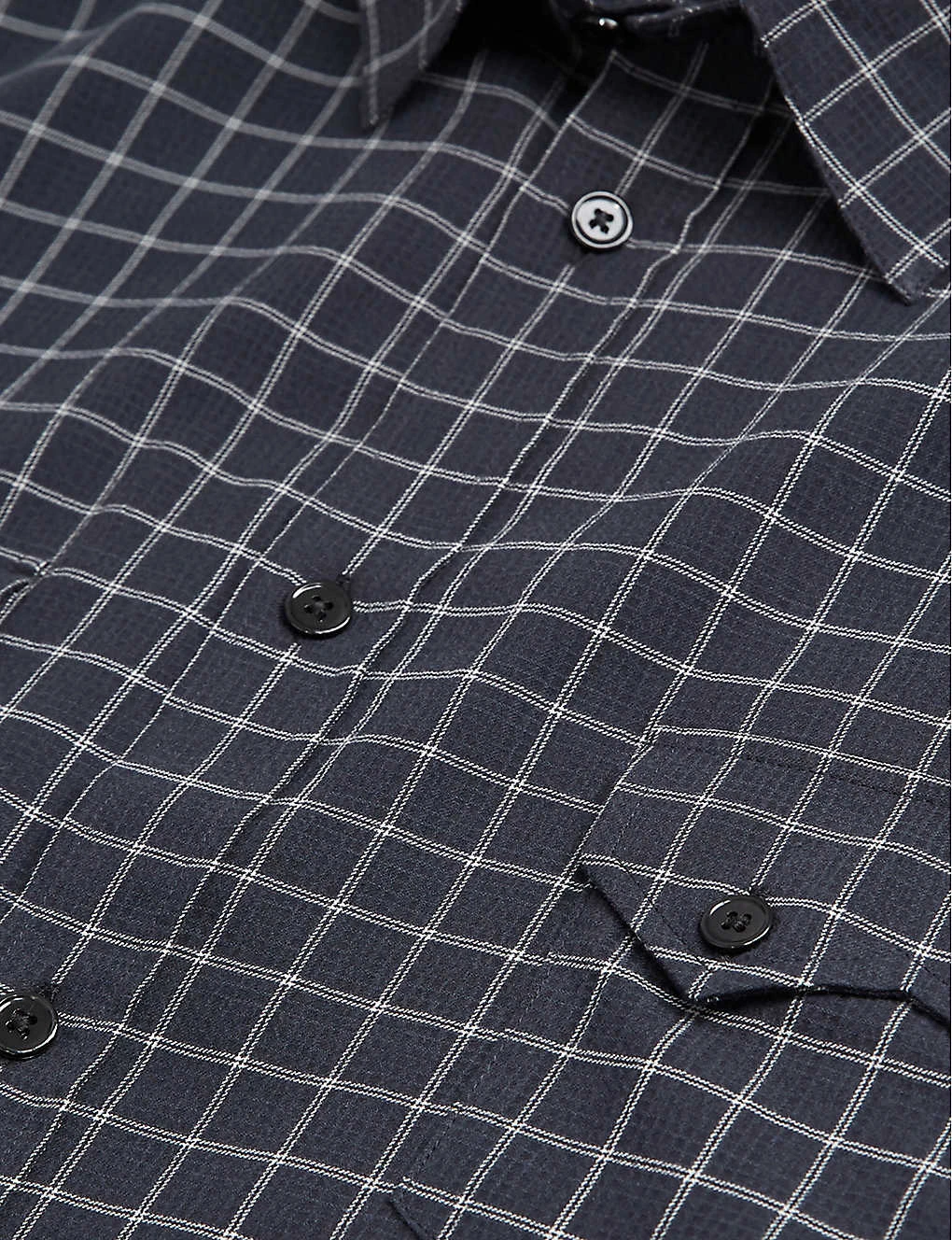 - Regular fit, long sleeves, classic collar, front button fastening, straight cut, all-over checked pattern, two chest flap pockets, buttoned cuffs, curved hem