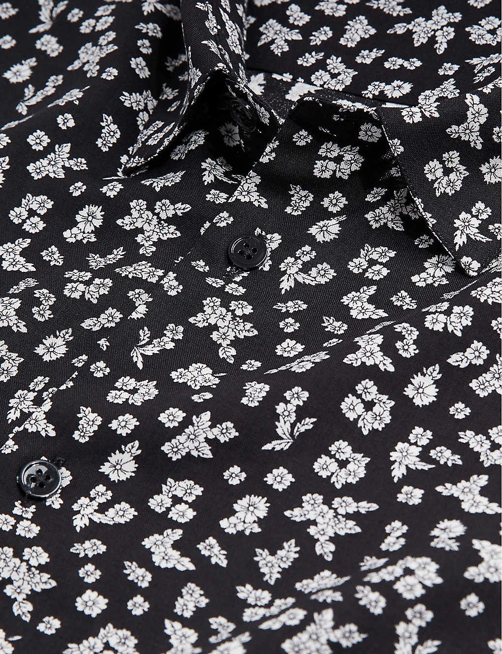 - Straight fit, long sleeves, buttoned cuffs, all-over floral print, curved hem