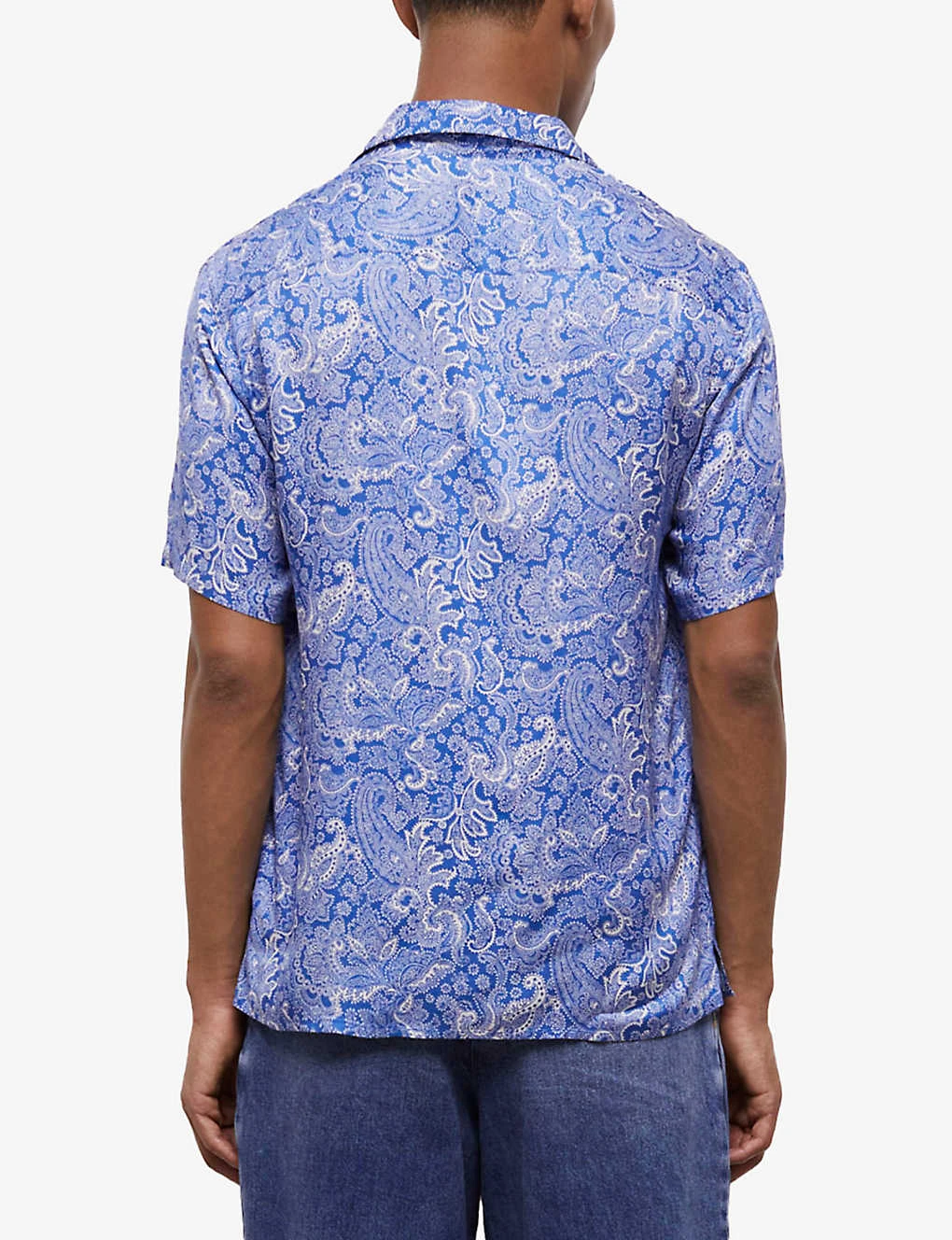- Hawaiian collar, short sleeves, pearlescent buttons, all-over paisley print