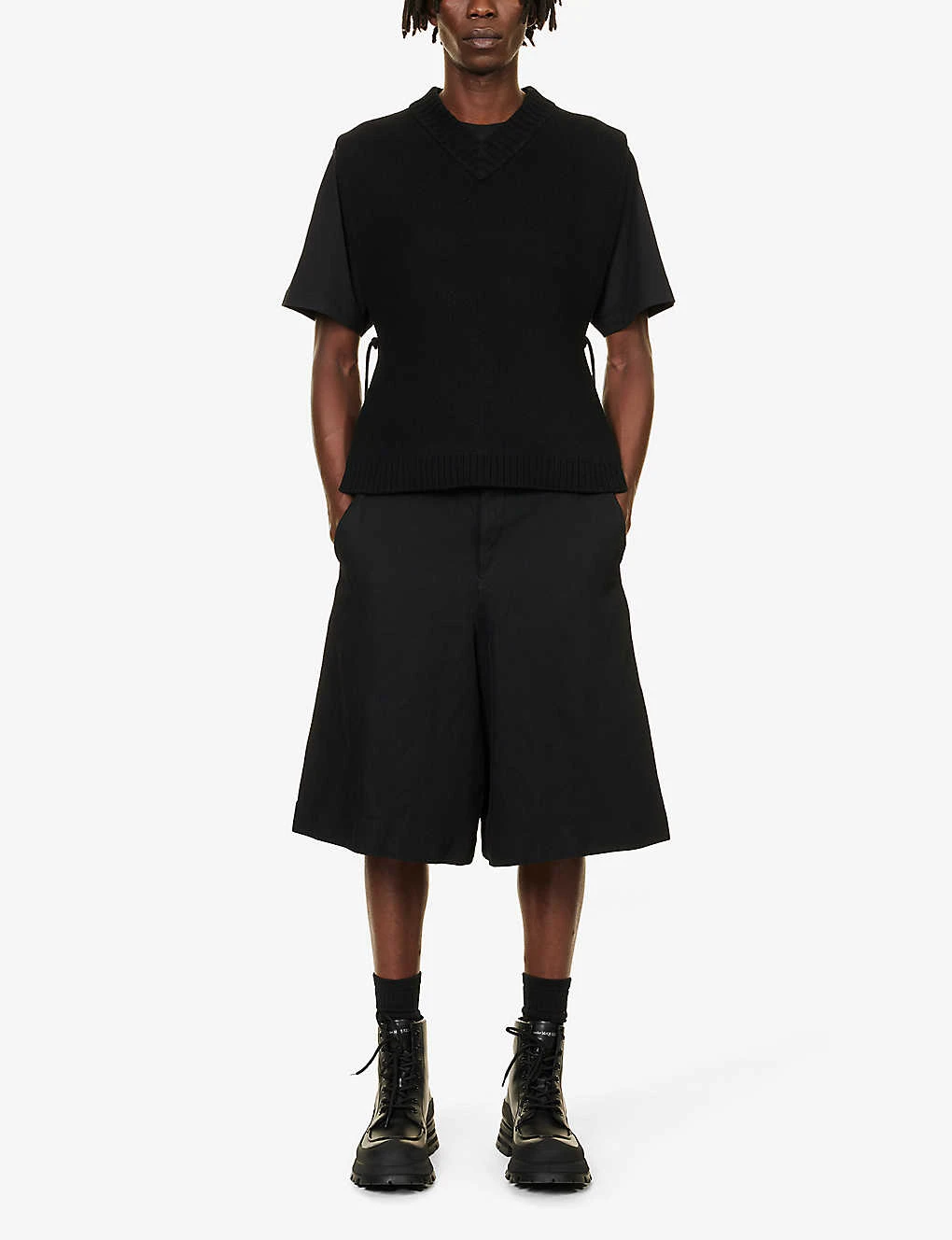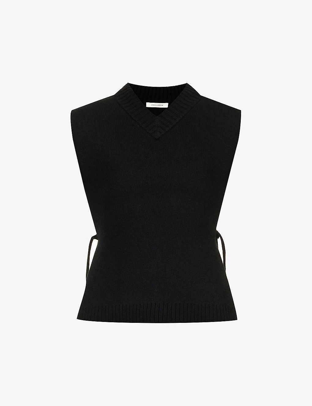 - Regular fit, V-neck, sleeveless, medium knit, self-tie straps at sides, ribbed trims