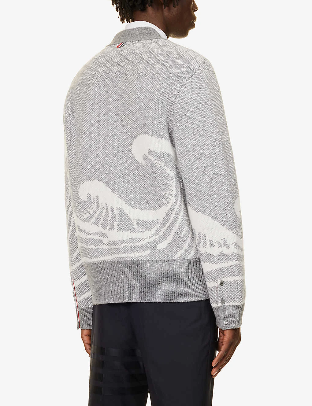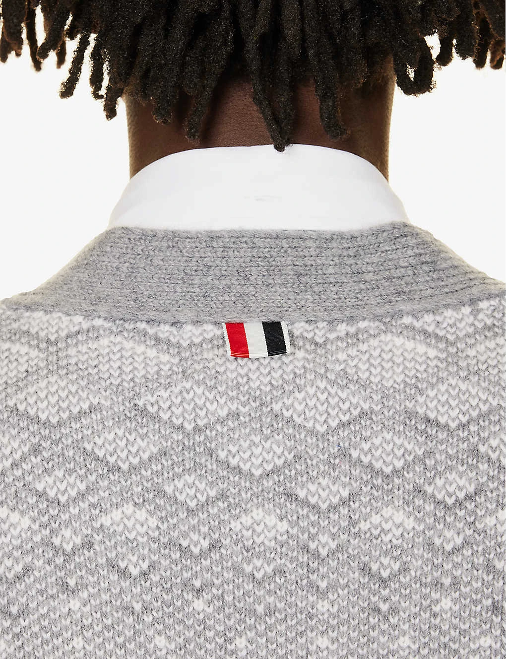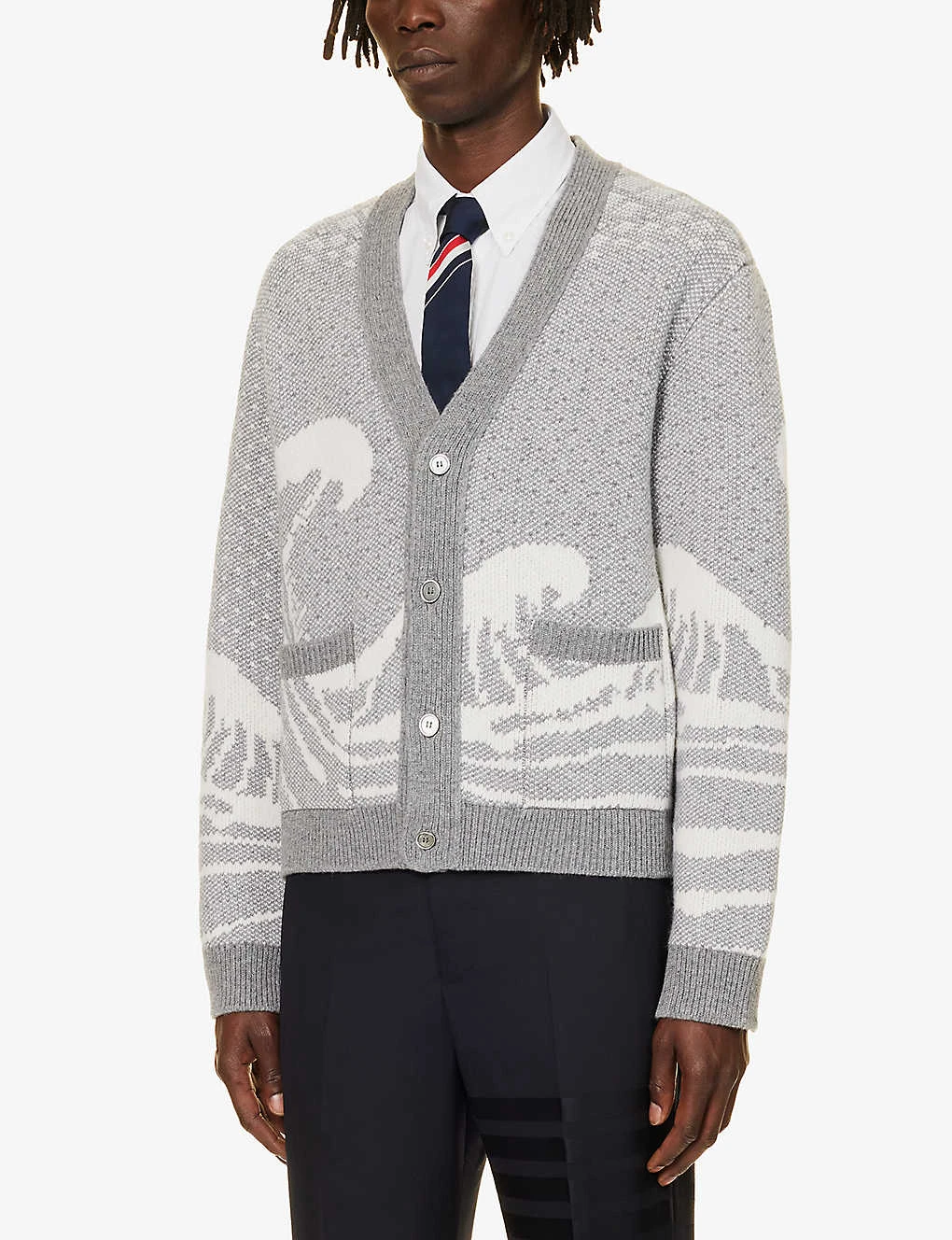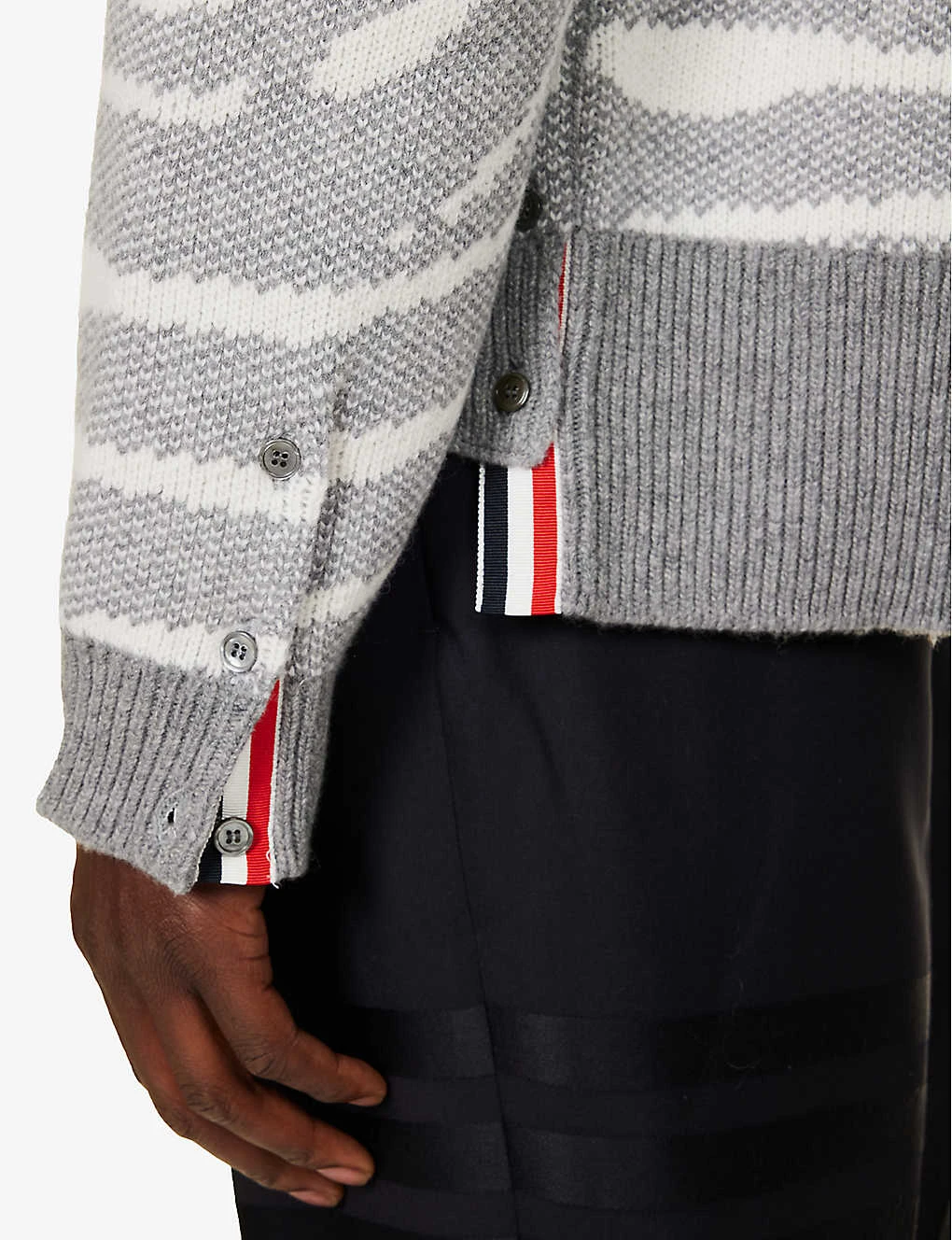 Wave-jacquard Patch-pocket Wool-knit Cardigan